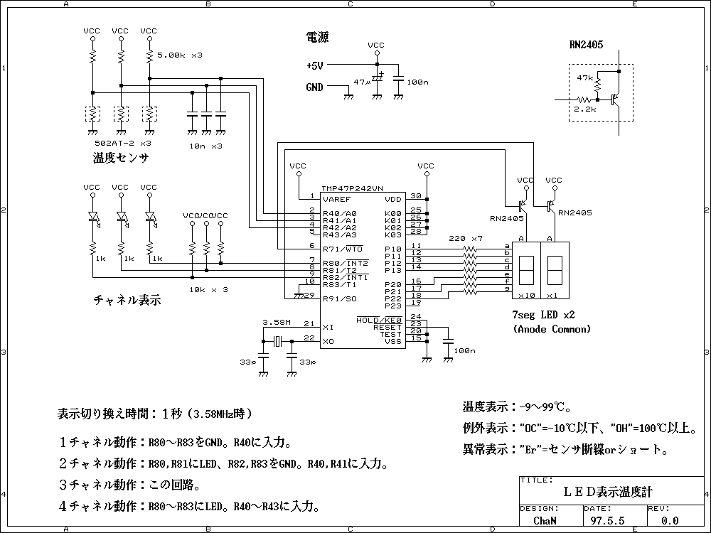 まず、組み込む場所はフロントパネルのクロック表示窓とします。このクロック表示窓は最近はほとんど意味の無いものとなっていますのでちょうど良いところです。フロントパネルの裏側に組み込むわけですから、相応のサイズでなければなりません。5cm四方以下を目標としましょう。測温範囲は常温から 100℃程度までとします。温度表示は大雑把でいいわけですから、1℃ステップ表示で絶対精度は±1℃程度として無調整化を図ります。また、発熱の気になる物は CPUだけではないので、複数のポイントの温度を測れるようにします。ということで、最終的に次のような仕様としました。