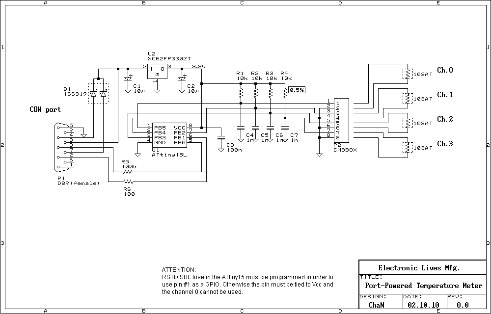 今回は、ATtiny15Lを使用してみました。このチップは、8ピンAVR中では唯一10bitADCを内蔵しています(2002年)。ADCのフロントエンドには内蔵リファレンスや差動アンプも付いています。動作クロック源は、高精度内蔵OSC(1.6MHz)に固定されていて、それ以外のクロック源は選択できません。まぁ、8ピンなので外部発振子で貴重なポートを潰すのは間抜けだということなのでしょう。また、タイマのクロックソースとしてPLLで16逓倍されたクロック(25.6MHz)があるので、高速なPWM出力が得られます。このようにtiny15のアナログ信号処理機能はなかなかのものです。本機では、ADCをシングルエンド、ゲイン×1で4チャネルフルに使っています。ただ、RESETピンもポートとして使うため、RSTDISBLヒューズをプログラムする必要があるので、HVSモードで書き込めるAVRプログラマが必要になります。