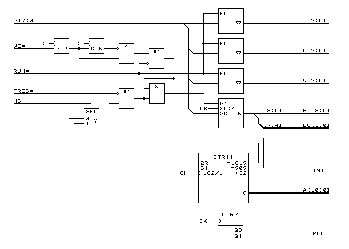 フレームメモリの容量は、ライン当たりのサンプル数×フレーム当たりのライン数だけ必要になるので、この場合は1820×525で、1Mサンプル分のフレームメモリを用意するのが正攻法といえます。さらに、8fsc(35nsサイクル)で途切れることなくデータを読み出せる必要があります。このような用途にはSDRAMが最適ですが、手持ちのジャンクSRAM(32Kバイト)を有効に使うため、何とかしてデータ量を圧縮する方法を考えてみます。