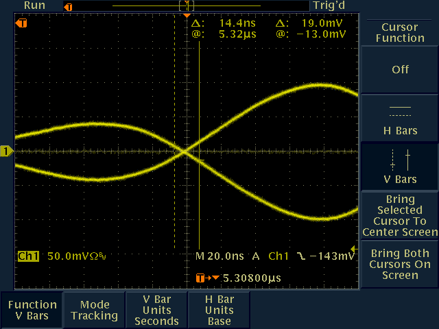 NTSCモードの100%カラーバー信号を選択して、TP4の波形をオシロで測ります。VR4でペデスタルレベルが0Vになるように、VR1で輝度のピークが1.43Vになるように調整します。片方を回すともう片方も少しずれるので、調整を2~3回繰り返します。TP5, TP6はY/CB/CRモードの100%カラーバー信号を出して、振幅を±700mVに調整します。