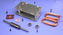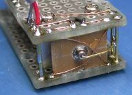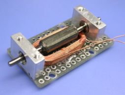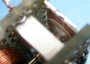 閉ループ制御とは、制御対象の状態(温度・速度・位置など)をフィードバックして指令値と比較しながら、誤差を無くすように制御することをいう。いわゆるサーボ制御のこと。写真は回転子の位置を測るための検出器の拡大である。光学式やら電磁式やら色々考えたが、構造の簡単な静電式を採用してみた。これは2組の電極(位置により静電容量の比が変化する)に交流電圧を加え、流れる電流の不均衡分を位置として検出するというもの。シャフトを押さえているバネは可動電極にGND電位を与え、同時に軸受けに与圧してガタをなくす役目をなしている。