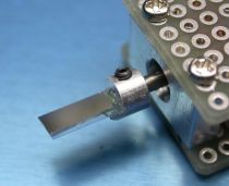 ミラーマウント。鏡を適当なサイズに切ってφ5mmアルミ棒を加工したマウントに接着。光学システムに使う鏡はほぼ例外なく表面鏡である。使用した鏡はエドモンドにて購入(150x38x1mmの表面鏡が\2200)。