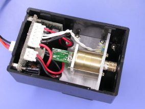 私も早速何個か購入してパワー計で計測してみたところ、そのままの状態で軒並み15mW程度も出ていた(ぉぃ(^^;)。ビームを白紙に当ててみると目も眩むほどの明るさで、小規模プロジェクションには十分な出力と思われる。しかし、モジュールの温度がある範囲内にないと極端に出力が落ちてしまうので、出力を安定化させるためマイコン制御のペルチェ素子等で加熱・冷却して、ケース温度を最適値に保つように制御してやらなねばならない。所詮安物のレーザーモジュールなので仕方ないだろう。
