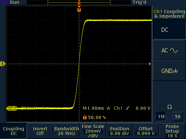 サーボのステップ応答(光学振れ角30度のとき)はこんな感じ。ン十万する高性能スキャナで500〜700μs程度なので、ジャンクな自作スキャナで1ms強なら、まずまずといったところか。予想していたよりもかなり良い性能で、とりあえず満足のいく結果となった。