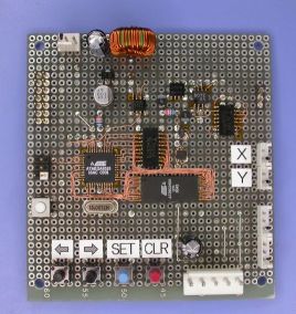 コントローラは単にベクトル信号とレーザーのON/OFF信号を生成すればいいので、とても簡単だ。主な部品は、マイコンチップと、フレームファイルをストアしておくフラッシュメモリ、それとベクトル情報をX軸とY軸への制御信号として生成する12bit-2chのDACだけ。
