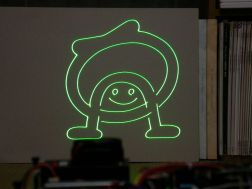 次に、アッピーたんを表示してみる。やや複雑なフレームなので26fps程度。これくらいになるとフリッカが感じられるようになる。一部のラインでスキャナの遅れを待たずにブランキングをかけてみたが、やはりタイミングがずれてしまった。ちゃんと始点終点では制定時間だけ待ってからブランキングをON/OFFした方がいいようだ。そして最後の仕上げとして、適当なビルの外壁にギコ猫たんをこっそり投射してみる(35fps)。これでとりあえず、当初の目標を達成!(^_^)。