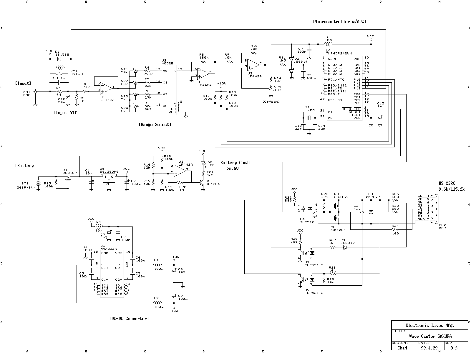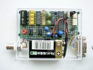 回路技術としてはごくありふれたものです。入力信号を増幅してADC内臓の4ビットマイコンでサンプリングしてホストへ送信しているだけです。レンジ切り替えは、ホストからのコマンドによりアナログスイッチやアッテネータを切り替えて行います。微少信号まで扱うため、写真では見えませんが、基板の裏をシールドしています。たったそれだけでも目にみえて外部ノイズの影響を防げました。