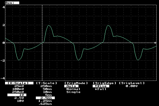 サンプリングレート10kspsというのはデジタルオシロとしては少々物足りないです。これはシリアルポートで転送することによる制限ですが、まぁ遊び半分ですし手軽さとの引き換えですからよしとしましょう(^_^;。でも、比較的低速な信号や物理現象などの観測にはけっこう使えるかな、といった感じでしょうか。