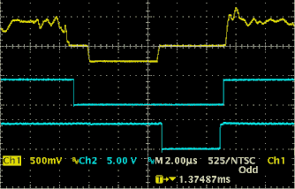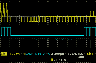まず、ビデオ出力端子は高級機を除いてAC結合が普通なので、受け側でDC再生する必要があります。Y信号に重畳された同期信号を取り除くためブランキング処理も必要です。これらの処理回路やその動作タイミングを生成する回路も必要になってくるのです。タイミングパルスの生成はめんどいので、PLDで片づけてしまいました。下のIMGに生成されたブランキングパルスとクランプパルスを示します。上から順に、Y入力、BLANK、CLAMPで、左が水平ブランキング付近、右が垂直ブランキング付近です。