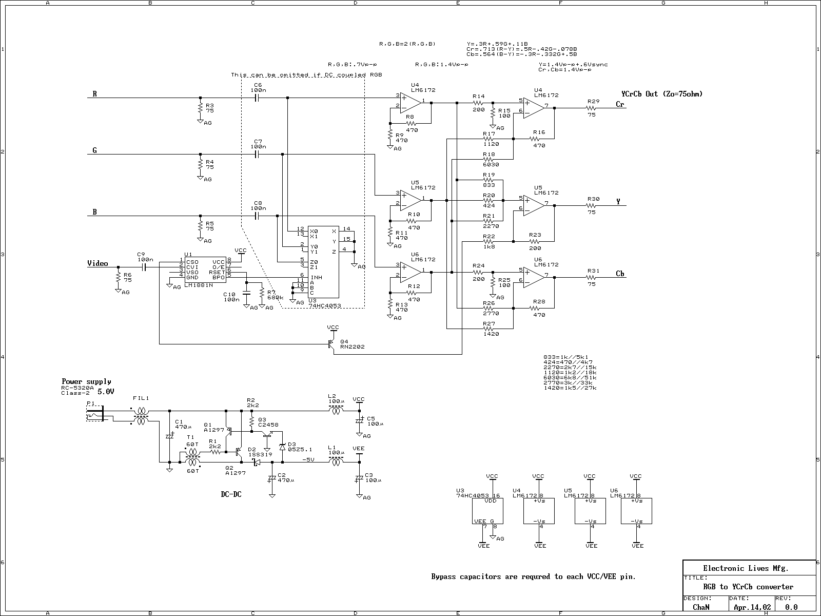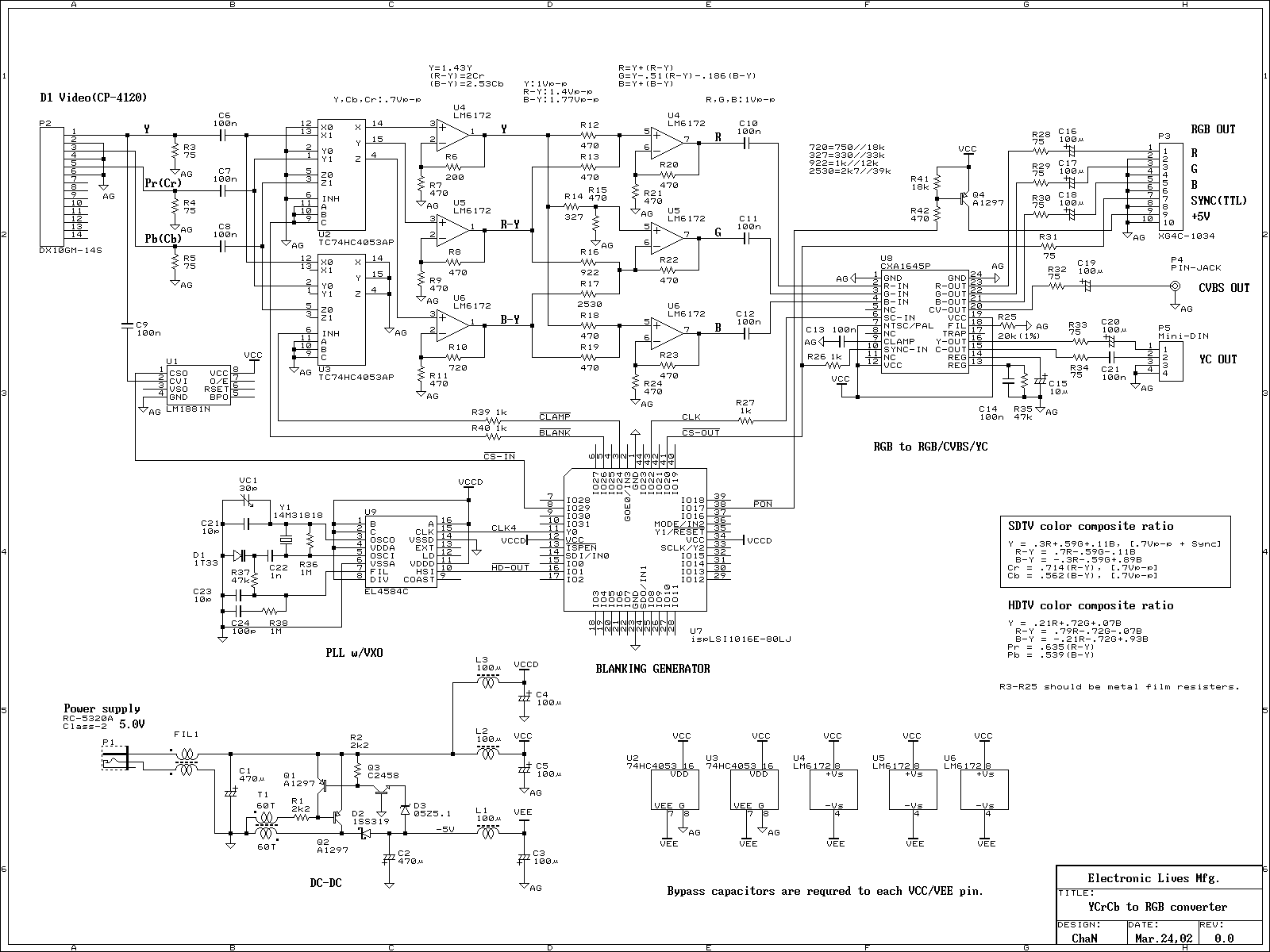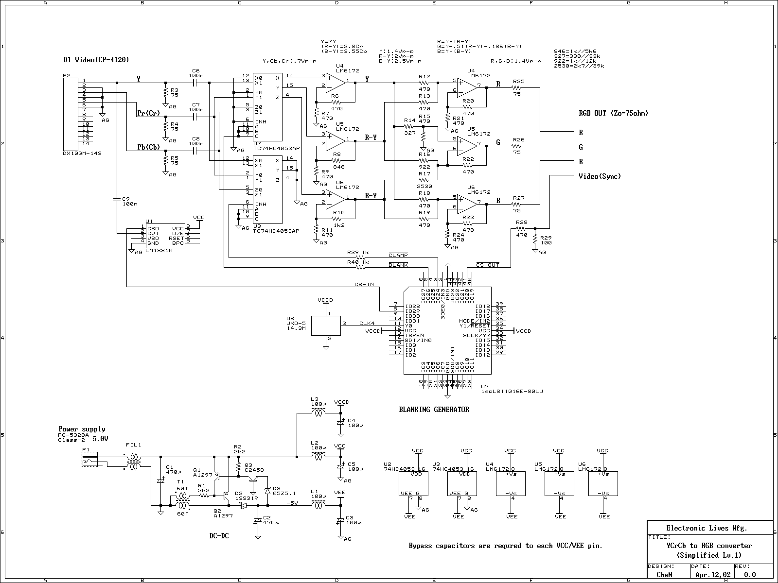 コンポーネント信号からRGB信号への変換は、OPアンプ回路のマトリックスを通して上で示す変換式をそのまま適用することによって行います。ただ、それだけでは不十分で、周辺回路も少々必要になってきます。